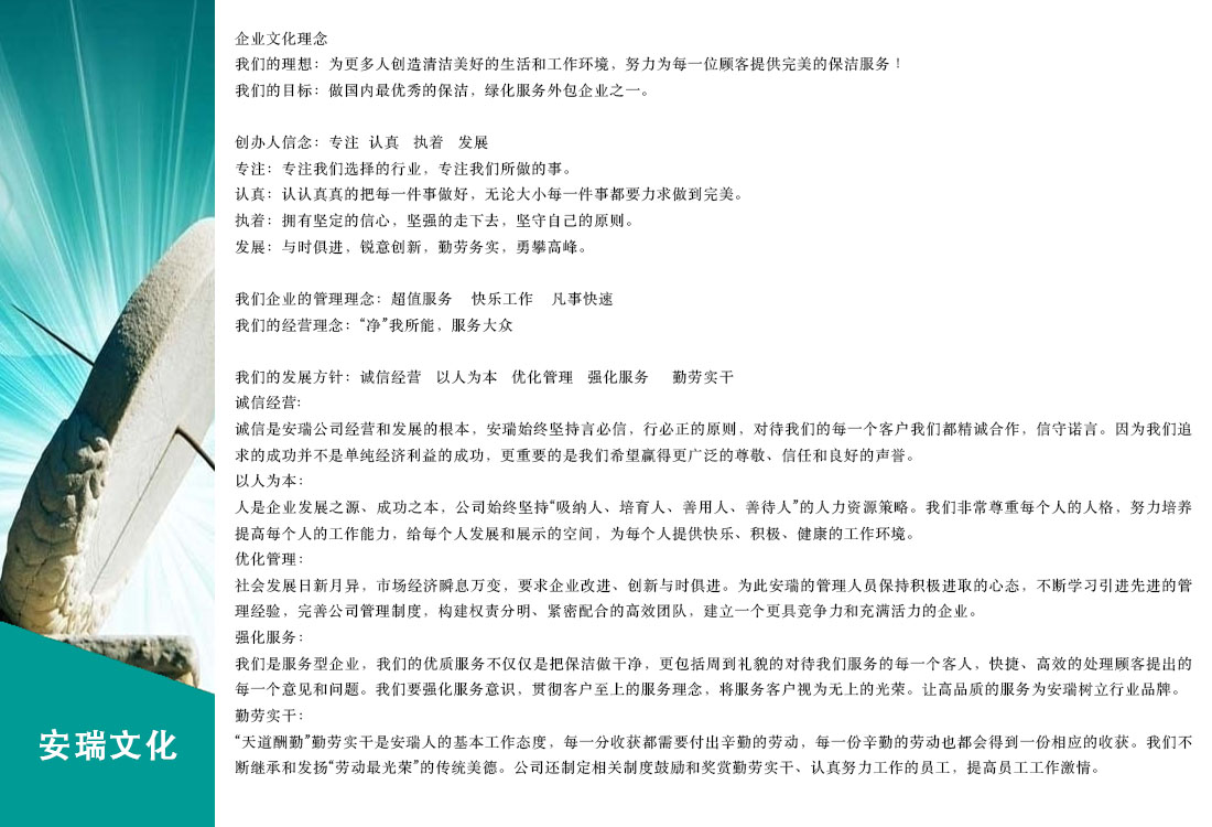 安瑞環境正以“創建經營規模化、樹立服務多元化、營造管理現代化”為發展戰略,堅持“立足長遠、精誠合作、技術創新、質量為本、優質服務”的經營方針,力爭打造成為國內具有影響力的現代化環境衛生綜合性的服務企業。
